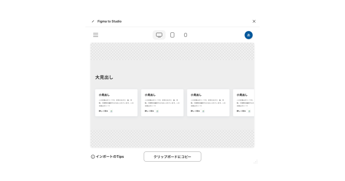 4. プラグイン「Figma to Studio」を起動+クリップボードにデザインをコピー
